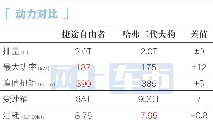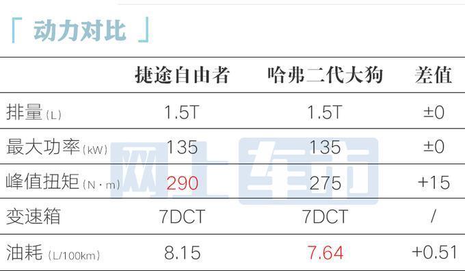 自由者1.5T车型匹配7DCT变速箱,2.0T车型匹配8AT变速箱,顶配带XWD适时四驱系统。与哈弗二代大狗相比,新车动力更强、油耗略高,但是每公里使用成本只差4-6分钱(按92号汽油计算)。