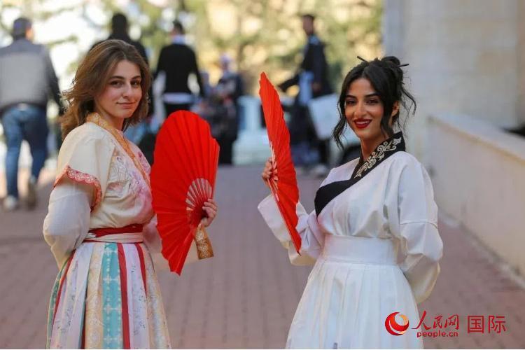 图为两位约旦费城大学学生在表演汉服走秀。人民网 纳达尔·达乌德摄